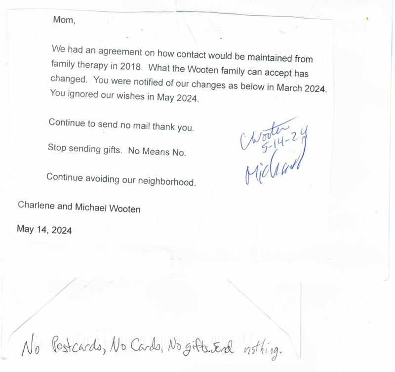 Nana keeps a copy of the cards and letters she has sent to you in the past. She'll keep a copy of future letters that she'll write but not expect you to receive because your parents will throw them away. You are always welcome in our hearts, in our lives, and in our house. We hope that some day when you're independent, you'll stop by and get to know us again. Nana has a blog where you can see what she's been up to.